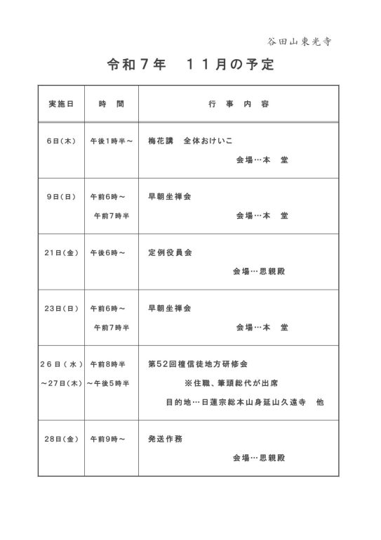| 6日(木) | 午後1時半~ | 梅花講 全体おけいこ | 本堂 |