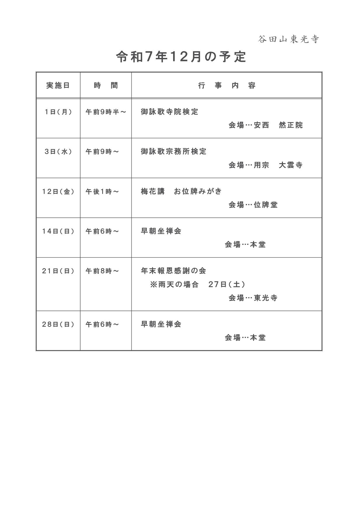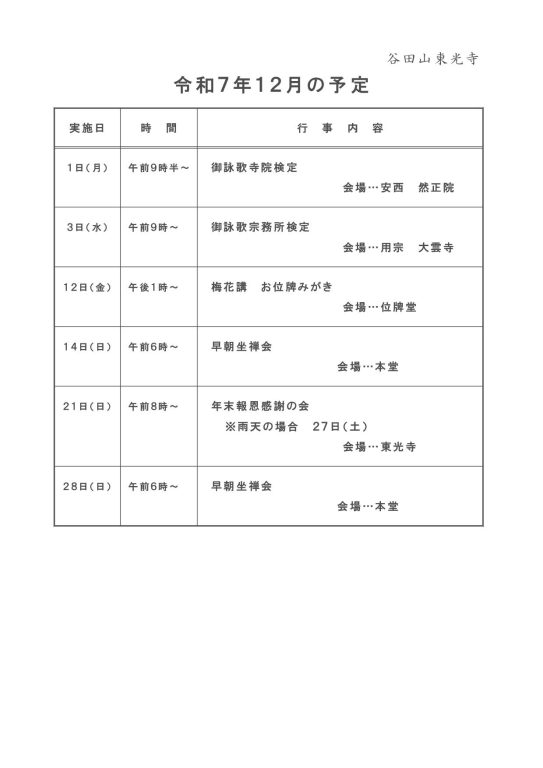 今月の予定(令和7年12月) – 谷田山東光寺